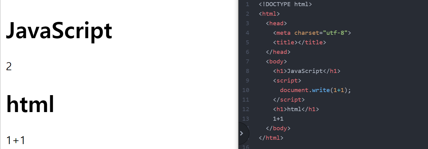 - html은 1+1을 입력하면 그대로 출력 / javascript는 1+1을 2로 계산해 출력
