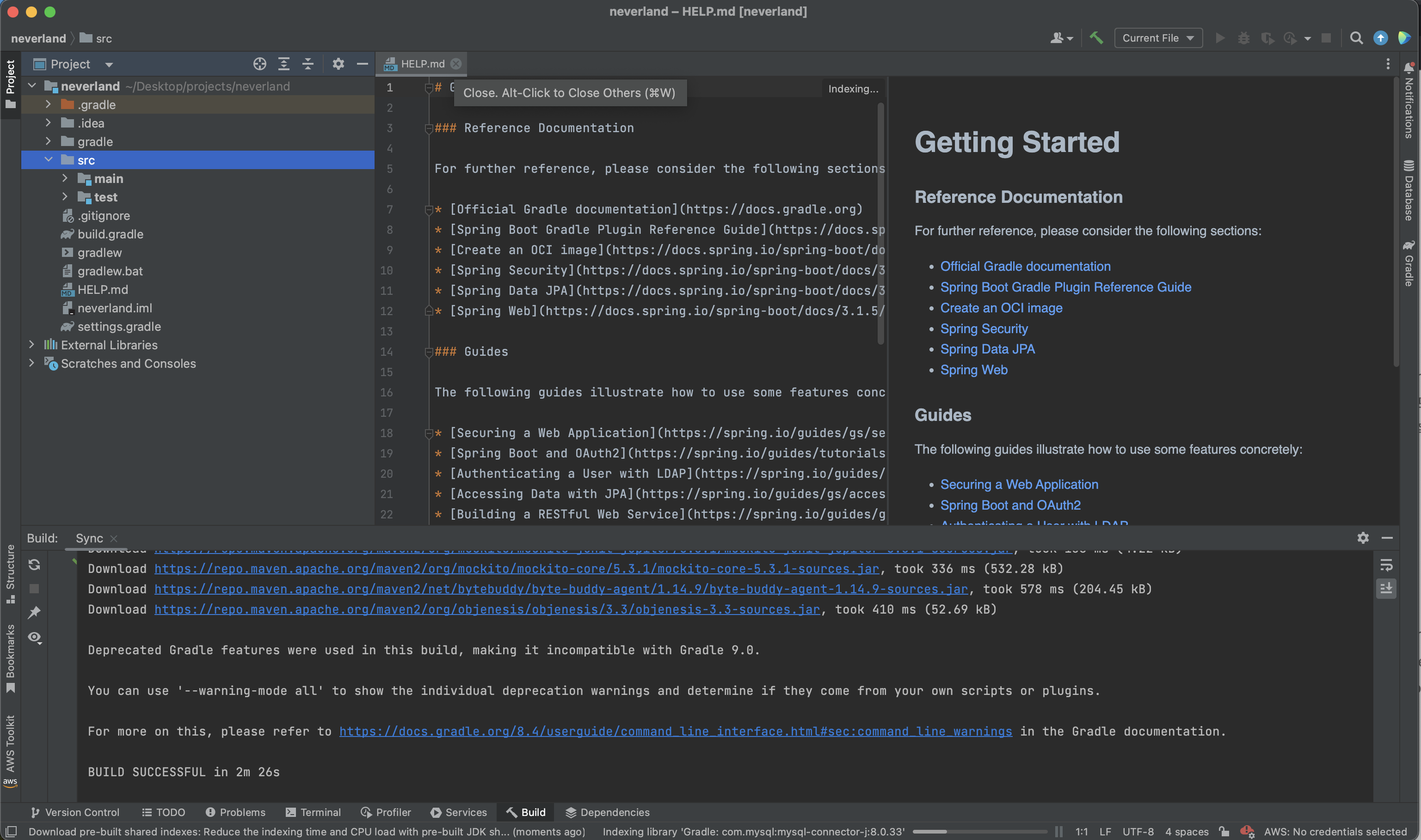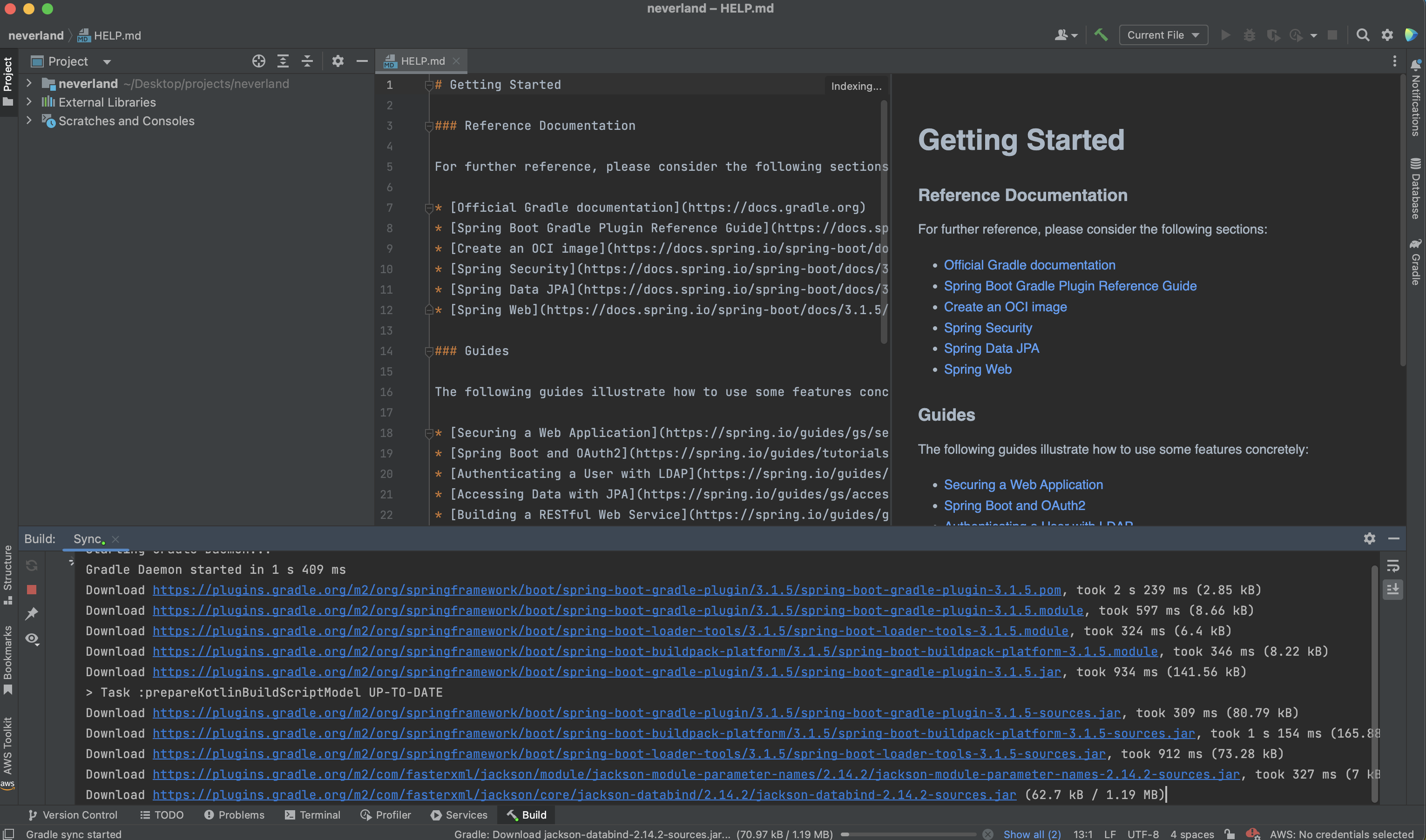 드디어! Create을 누르면 위와 같이 프로젝트가 시작되며 선택한 dependency 다운로드가 시작된다.