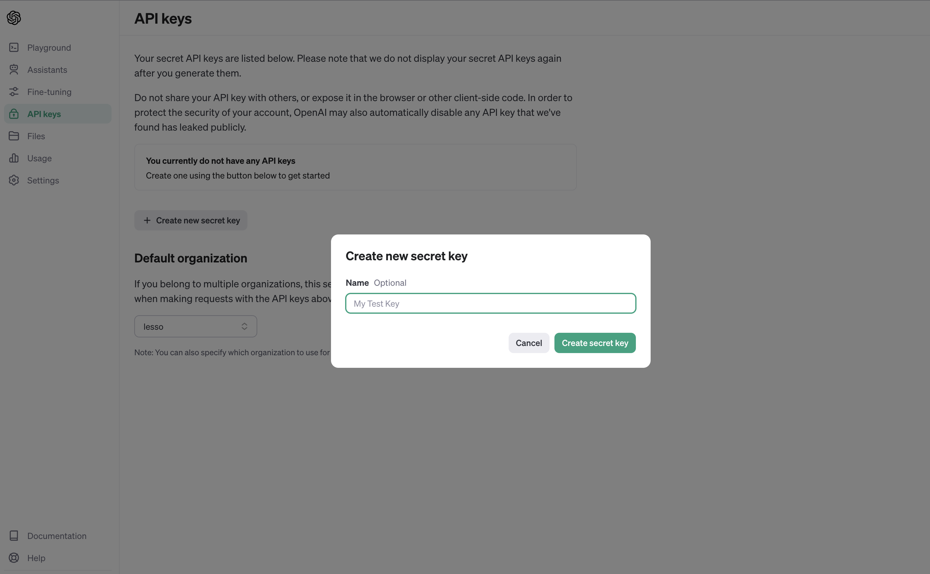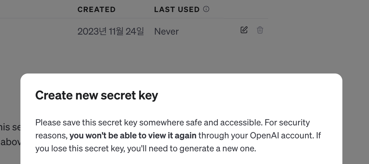위 설명에도 써있듯이, 다른 secret key들과 마찬가지로 Open AI API secret key도 처음 생성했을 때만 key value값을 알려주고, 다시 확인할 수 없다. 잊지말고 꼭 안전한 곳에 기록해두자!