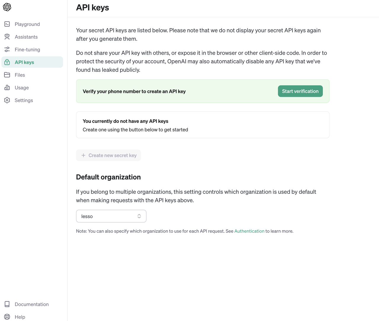 API Keys 탭을 누르면 아래와 같은 화면을 볼 수 있다. 계정을 새로 만들면 phone number 인증이 안된 상태일 것이기 때문에 Start verification 버튼을 눌러 번호 인증을 받는다.