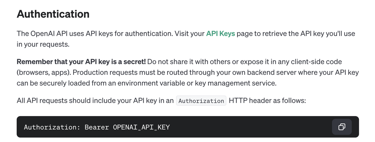 그리고 Open AI API를 사용하기 위해선 공식 레퍼런스에서 제공하는 것과 같이 현재 자신 계정의 API Key를 함께 요청 시 보내줘야 한다. 이제 방금 발급받은 API Key를 사용하도록 프로젝트에 설정해 주자.