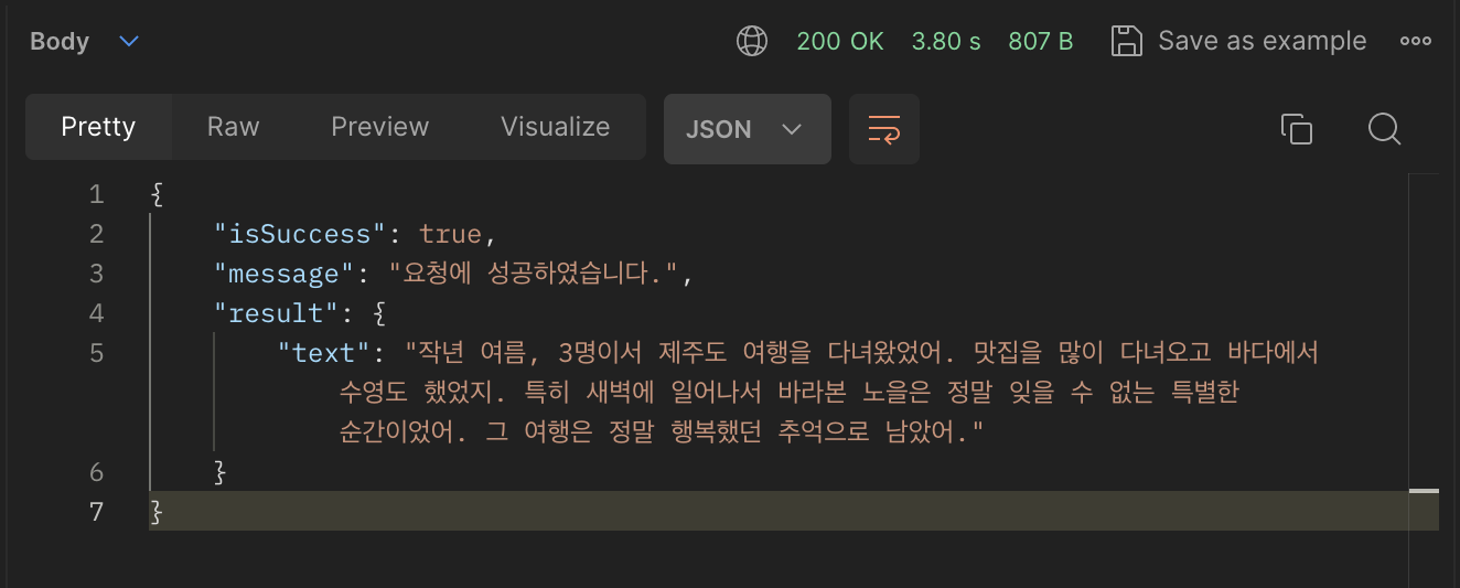 Chat-GPT가 요약한 텍스트값이 "text" 부분에 잘 들어가 있는 걸 확인할 수 있다.