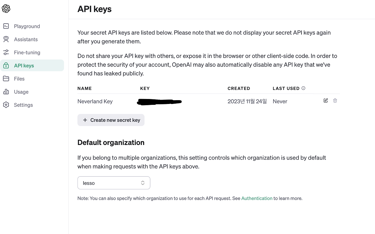 위 설명에도 쓰여있듯이, 다른 secret key들과 마찬가지로 Open AI API secret key도 처음 생성했을 때만 key value값을 알려주고, 다시 확인할 수 없다. 잊지 말고 꼭 안전한 곳에 기록해 두자!