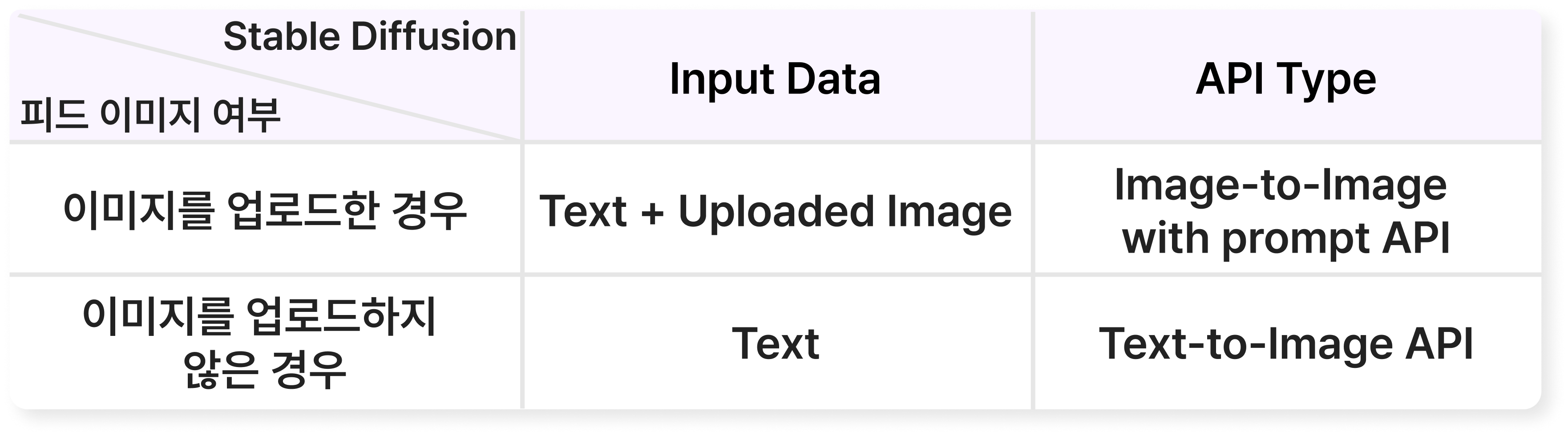 이후 유저가 피드 이미지를 업로드했는지 여부에 따라, Stable Diffusion의 입력값과 호출되는 API가 다음 표와 같이 결정된다.