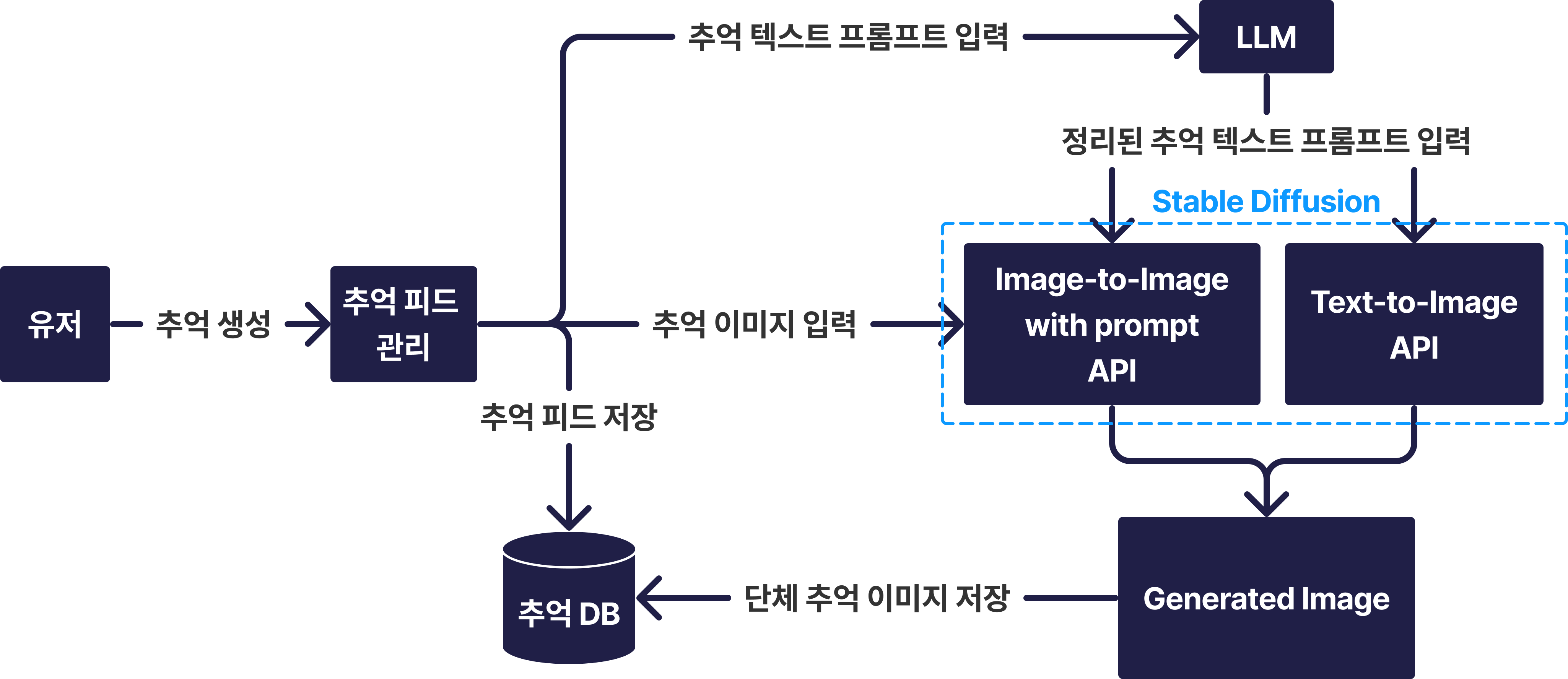 공동 추억 이미지를 자동 생성하는 기능을 구현하기 위해, 유저들이 입력한 피드 데이터를 모아 LLM(Chat-GPT)의 프롬프트로 입력한다. 한 추억에 대한 유저들의 여러 데이터들을 Chat-GPT를 통해 하나의 글로 요약한 후, 이미지 생성 AI 모델인 Stable Diffusion의 입력값으로 사용한다. Stable Diffusion 모델은 앞서 요약한 글과 피드 이미지를 이용해, 공동 추억 이미지 데이터를 생성한다. 최종적으로, 생성된 공동 추억 이미지 데이터가 추억 DB에 피드 형식으로 저장되고, 유저의 요청이 들어올 경우 추억 DB를 통해 피드 데이터를 조회할 수 있다.