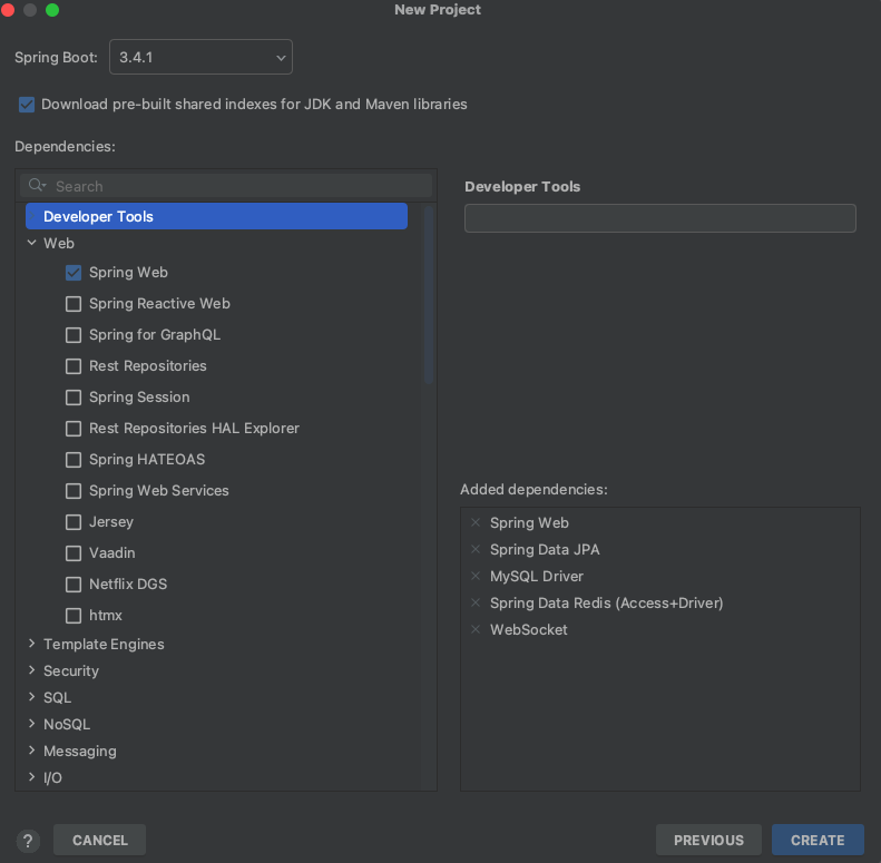해당 프로젝트에서는 Spring Web, Spring Data JPA, MySQL Driver, Spring Data Redis, WebSocket을 선택했다.
