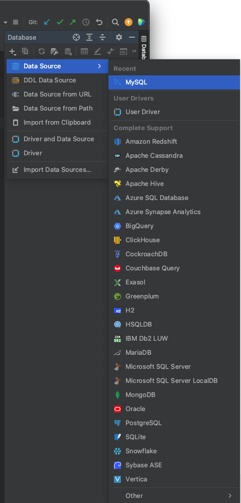IntelliJ 오른쪽 툴바에서 Database를 클릭해 패널을 열어 Data Source를 추가해보자. RDS를 MySQL로 생성했기 때문에 MySQL을 골라준다.