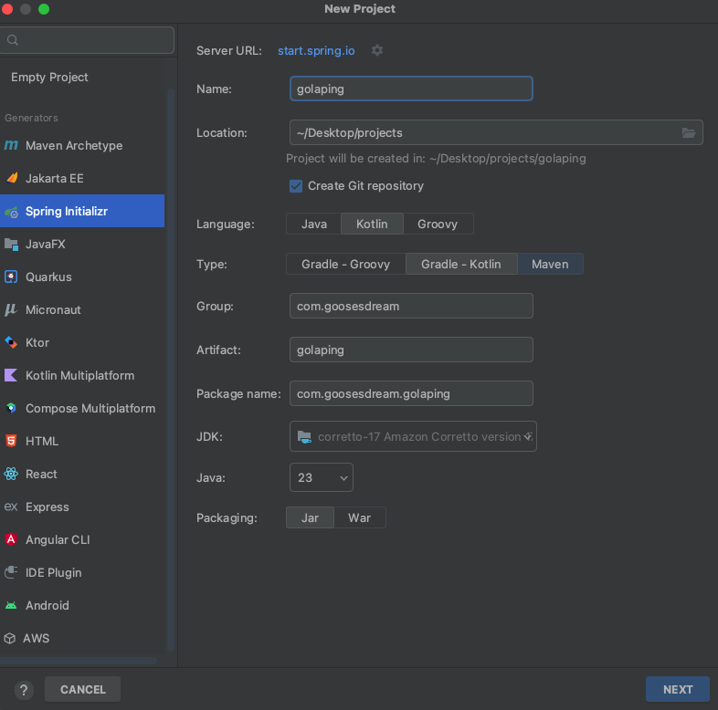 Language는 Kotlin으로 선택하고, Type도 Gradle - Kotlin을 선택해준다. Group과 Artifact는 각각 팀명과 서비스명으로 채워준다. JDK는 17버전으로, Java는 23으로 지정했지만 추후 세팅 과정에서 21로 수정해줬다. 그리고 Packaging은 Jar 방식으로 선택한다.