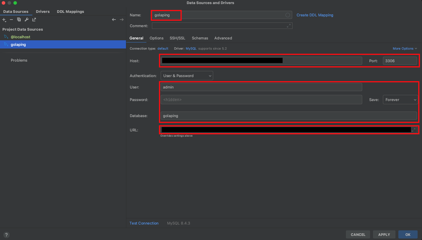 - URL: Host값과 Database값으로 이 부분이 아래와 같이 자동으로 채워졌을텐데, 추가로 더 설정해줄 것들이 있다면 url에 붙여준다.
