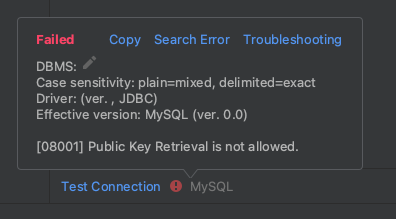 URL값을 이렇게 설정하고 Test Connection을 시도했을 때 아래 이미지와 같이 Public Key Retrieval is not allowed 에러가 발생하며 연결에 실패했다.